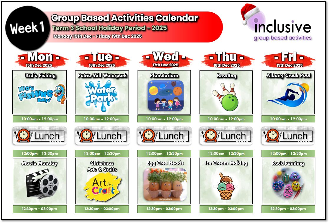 Inclusive Disability Assist’s Group Based Activities for the Children’s School Holiday Program – offers a fun, supportive environment for children aged 4 to 16 with a psychosocial disability. Designed to promote social connection, creativity, and confidence, the week is packed with tailored activities that cater to diverse interests and abilities. From hands-on crafts and interactive games to sensory-friendly experiences, each day is thoughtfully planned to ensure every child feels included, engaged, and empowered